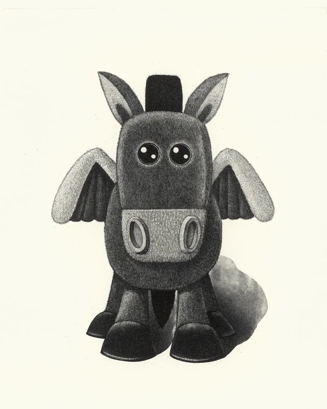While designed objects, Coke bottles and beer cans, had been a regular motif against the equally ubiquitous native banksias, stones and shells, the plush toys are of a different order. Firstly, the previous synthetic appearances were primarily waste, detritus discarded by consumption or careless intoxication, whereas the toys are always pristine, never taken off the shelf, not battle worn as lives lived must be. Secondly, the waste products were of consumption items, whereas the toys are already representations of nature, making Kempson’s prints representations of representations. This second-order hall-of-mirrors game emulates the seriality of printmaking, where the image is worked up on a plate to then almost like magic be transferred to the final surface. This is not at all surprising from such a masterful and dedicated printmaker, who has spent decades reflecting on and perfecting his craft. Since then, Kempson has undertaken a major cycle of work inspired by this experience which features soft children’s toys as its subject matter, and Child’s Play is the latest and most majestic contribution.